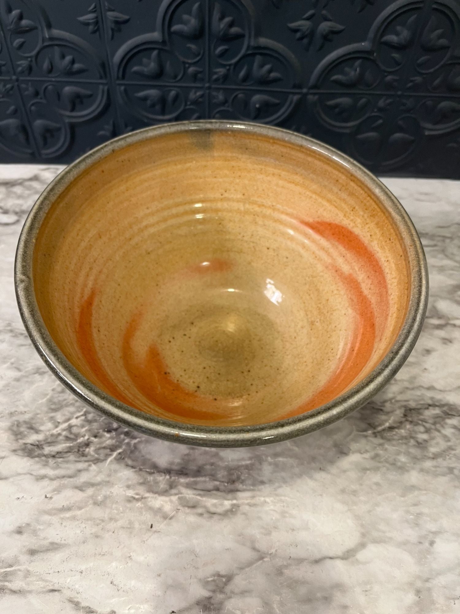 Pottery bowl with green swirls
